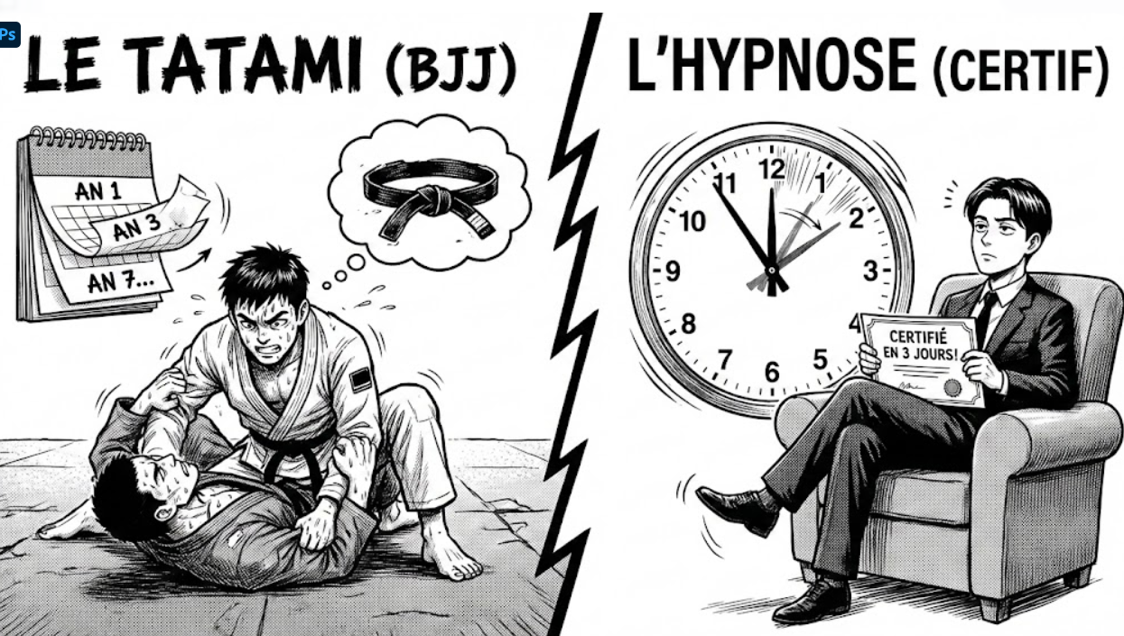 It takes between 7 to 15 years to become a black belt, with criteria specific to each school, just like in hypnosis. For me, there is already the time factor involved, and with rare exceptions, a maturity gained on the tatami.