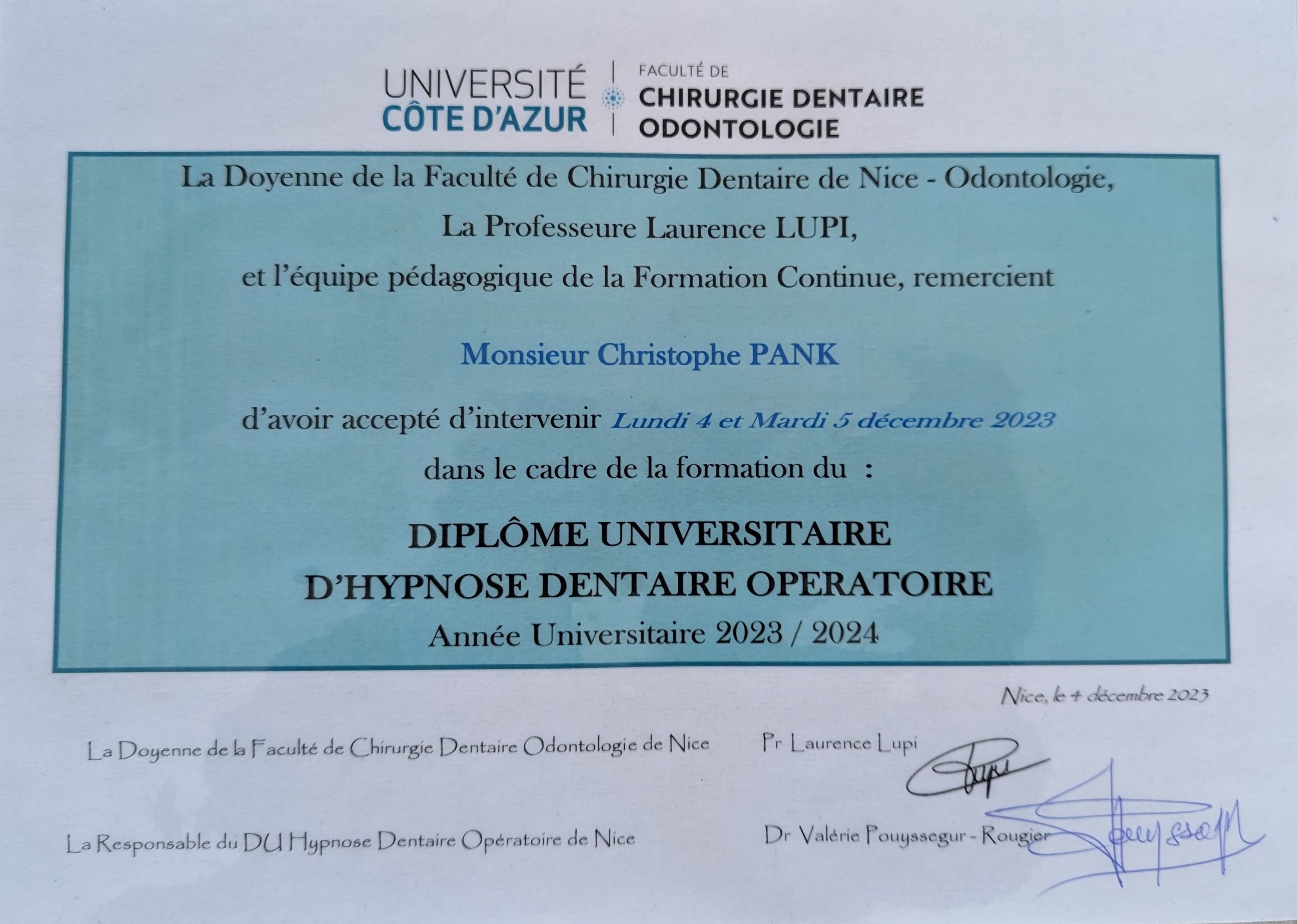 Ces derniers jours, j’ai pu partager des connaissances sur les processus inductifs et les approfondissements dans le cadre du Diplôme Universitaire d’Hypnose Dentaire Opératoire.