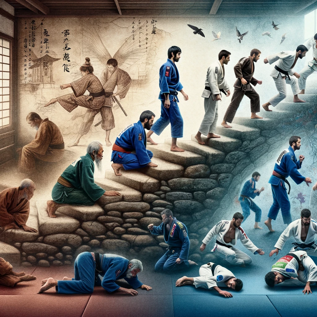 C’est également la force de Gracie qui a continué la forme “affinée” par Conde Koma pour en faire un système de self-defense et de jeu d’opposition au sol. Nous sommes loin des travaux à genoux des Japonais dans les formes passées, voire passéistes.