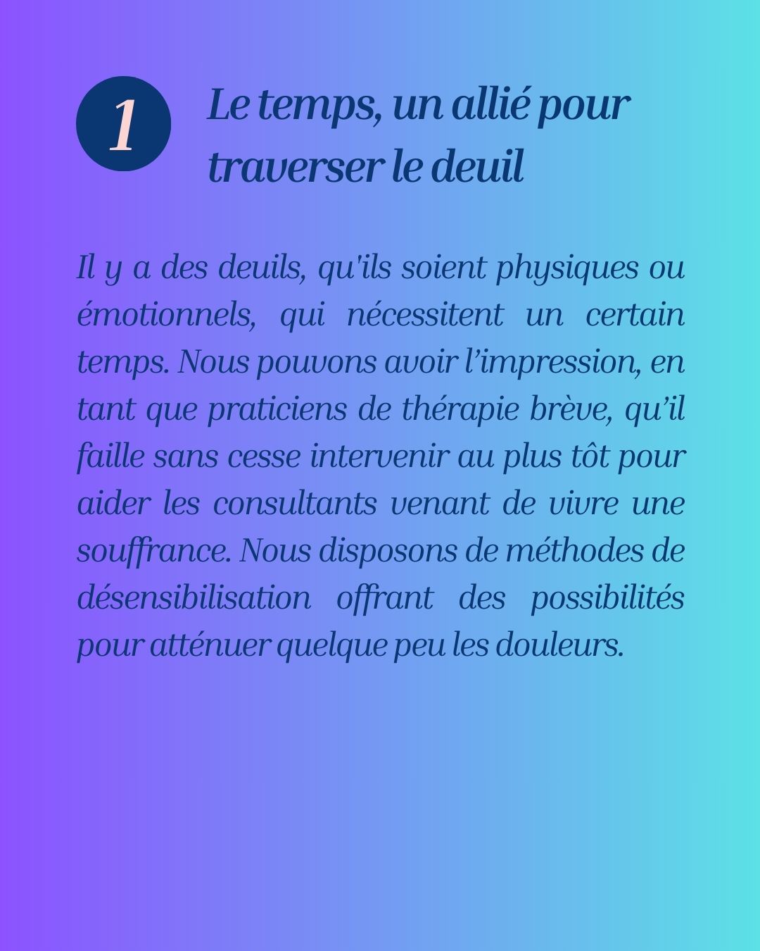 Il y a des deuils, qu’ils soient physiques ou émotionnels, qui nécessitent un certain temps. Nous pouvons avoir l’impression, en tant que praticiens de thérapie brève, qu’il faille sans cesse intervenir au plus tôt pour aider les consultants venant de vivre une souffrance. Nous disposons de méthodes de désensibilisation offrant des possibilités pour atténuer quelque peu les douleurs.