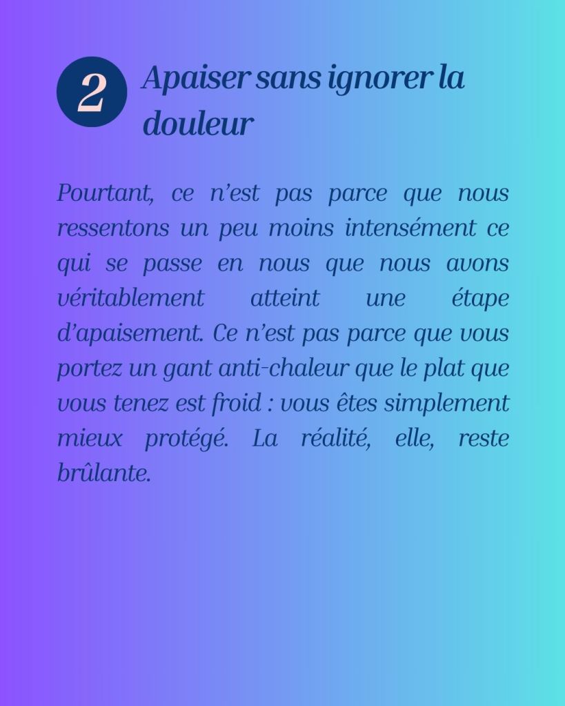 Pourtant, ce n’est pas parce que nous ressentons un peu moins intensément ce qui se passe en nous que nous avons véritablement atteint une étape d’apaisement. Ce n’est pas parce que vous portez un gant anti-chaleur que le plat que vous tenez est froid : vous êtes simplement mieux protégé. La réalité, elle, reste brûlante.