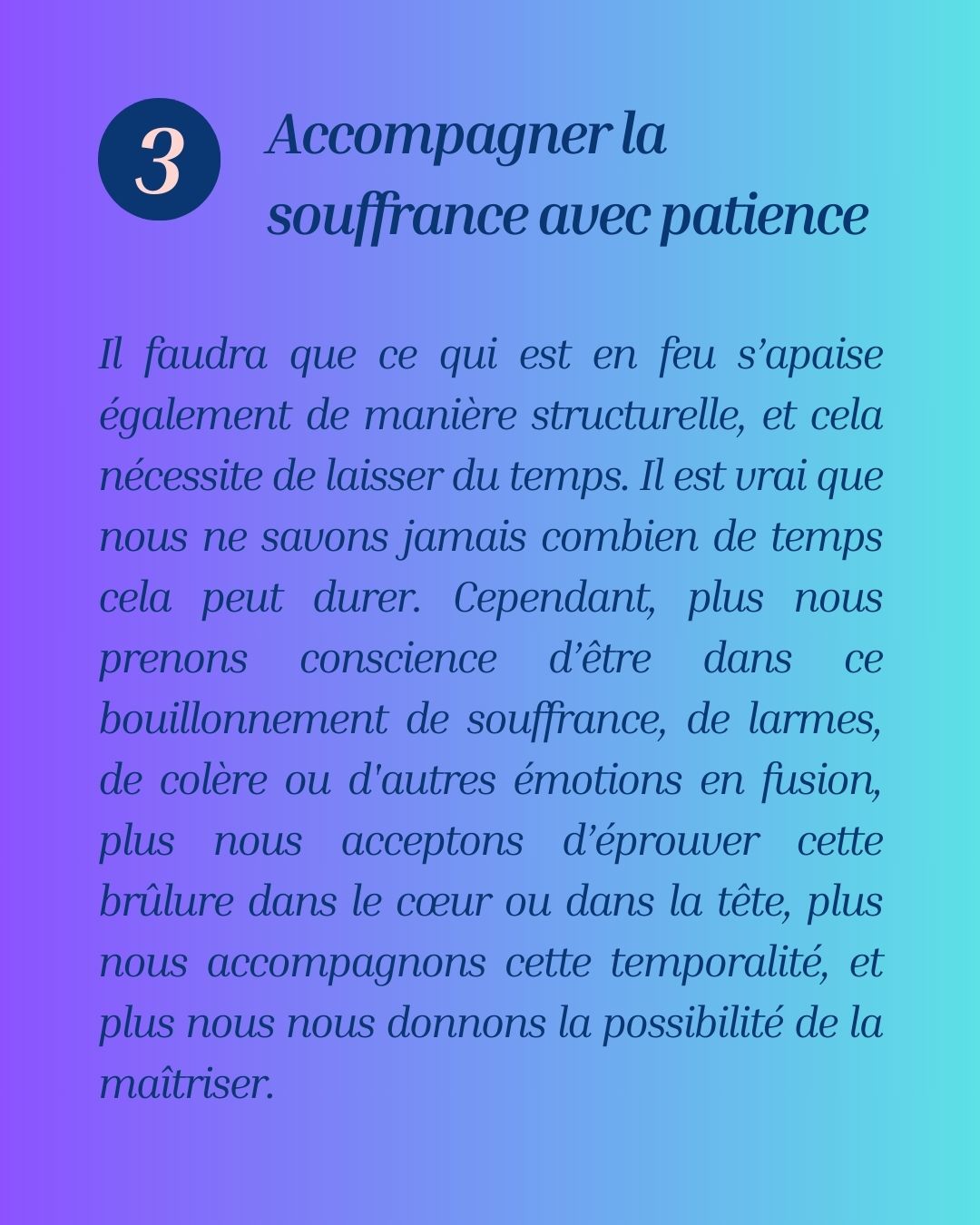 To master it, not by controlling it or arrogantly claiming it does not affect us, but by accepting this fragility, this pain, and its consequences without yielding to them. Not allowing ourselves to be stifled, but simply breathing and letting things circulate, as with physical pain, so that what burns may cool, so that we no longer fuel the fire, and finally, let our mind find rest.