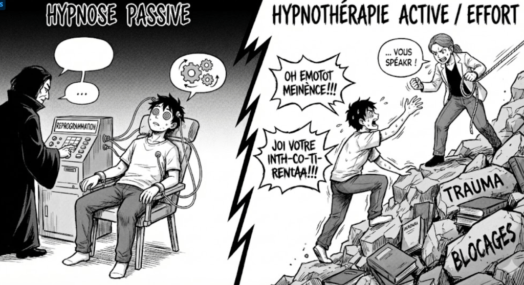 C’est pour cette raison qu’à mes yeux, l’hypnose n’est pas de l’hypnothérapie. Cette dernière va, avant toute reprogrammation, tenter de faire émerger du subconscient vers le conscient des mots, des gestes, des processus.