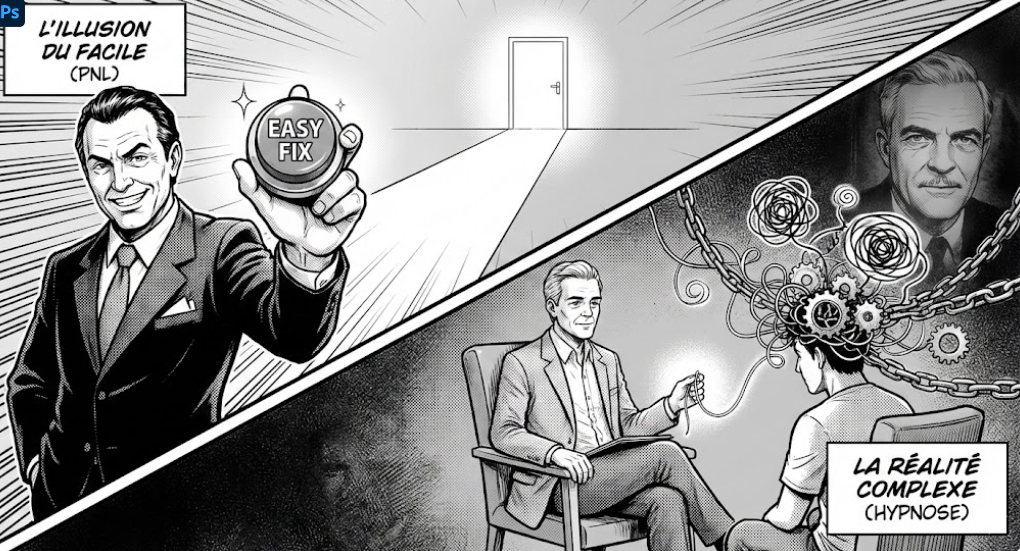 Je suis un fan de PNL. C’est par ce chemin que je suis entré dans l’hypnose. J’aime cette façon de créer des outils simples qui sont efficaces dans bien des situations. Avec le temps, que ce soit en France ou aux US, j’ai l’impression que la PNL, cette façon plus simple de s’approprier le travail d’Erickson, a peut-être ouvert la voie à une confusion.