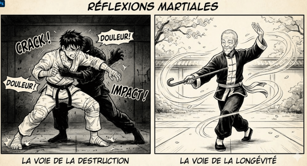 De même en Kyokushin, parfois, il y a une volonté de montrer un esprit fort, mais on voit des pratiquants qui ne cessent d’avoir des bleus et des douleurs, portant constamment des bandages. Pourtant, si nous voulons atteindre des âges avancés dans notre pratique, comme « Ken Jin », un sensei qui me disait qu’il montait sur le tatami à 75 ans, ou Dominique Valéra qui en a 78, nous devrions être plus doux.