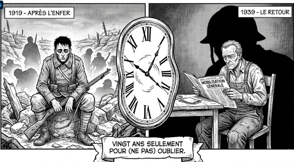 Vingt petites années pour digérer 1,4 million de morts français, rebâtir un territoire et chercher à redonner un sens à la vie. On entend des « et si nos gouvernements avaient agi en 33 ou 36… » soit 15 à 18 ans après le conflit. Mais il est possible que vous ayez pu constater que 20 ans, ce n’est rien. Ce n’est certainement pas digérable si facilement. Surtout quand on voit que des supporters de football ne digèrent toujours pas la défaite de la France contre l’Italie en 2006… il y a bientôt 20 ans.