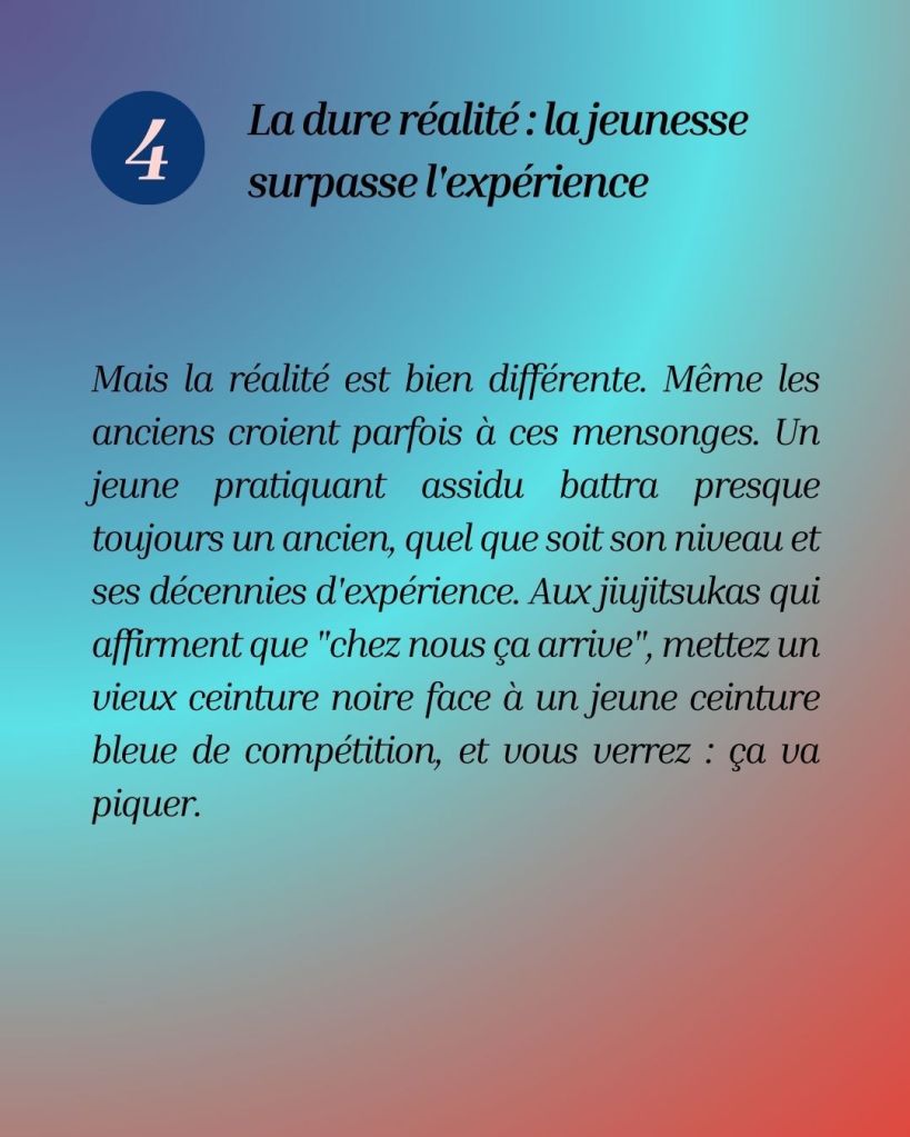 Mais que reste-t-il de tout cela ? Beaucoup de mythes et peu de réalités. Ce que les anciens ont transmis comme « valeurs » – aller au-delà de la douleur, ignorer les signaux du corps, revenir s’entraîner malgré des blessures ou encore passer des examens dans un état physique inadéquat – ne relève pas de la force ou de la sagesse, mais bien de l’ignorance et parfois de la bêtise. Ces comportements ont causé des blessures graves, des séquelles durables, et même des abandons.