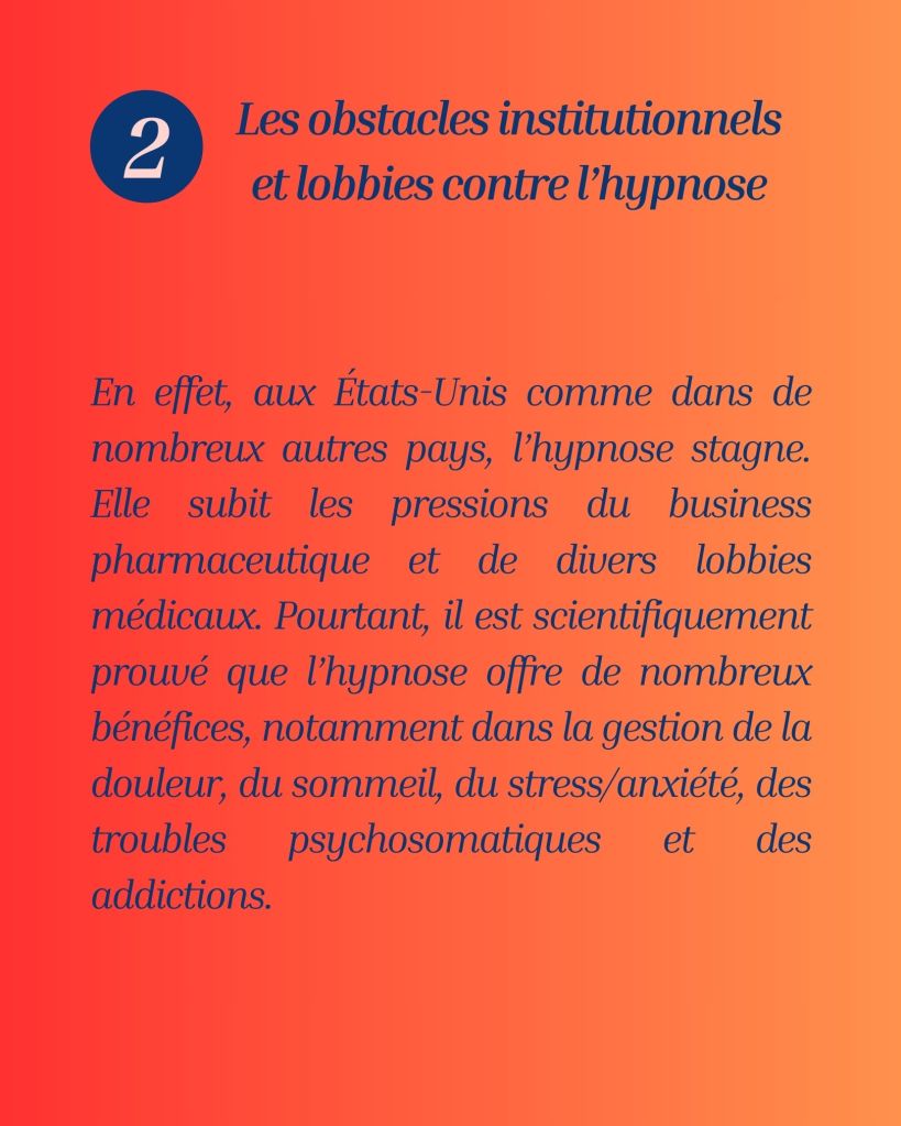 En effet, aux États-Unis comme dans de nombreux autres pays, l’hypnose stagne. Elle subit les pressions du business pharmaceutique et de divers lobbies médicaux. Pourtant, il est scientifiquement prouvé que l’hypnose offre de nombreux bénéfices, notamment dans la gestion de la douleur, du sommeil, du stress/anxiété, des troubles psychosomatiques et des addictions.