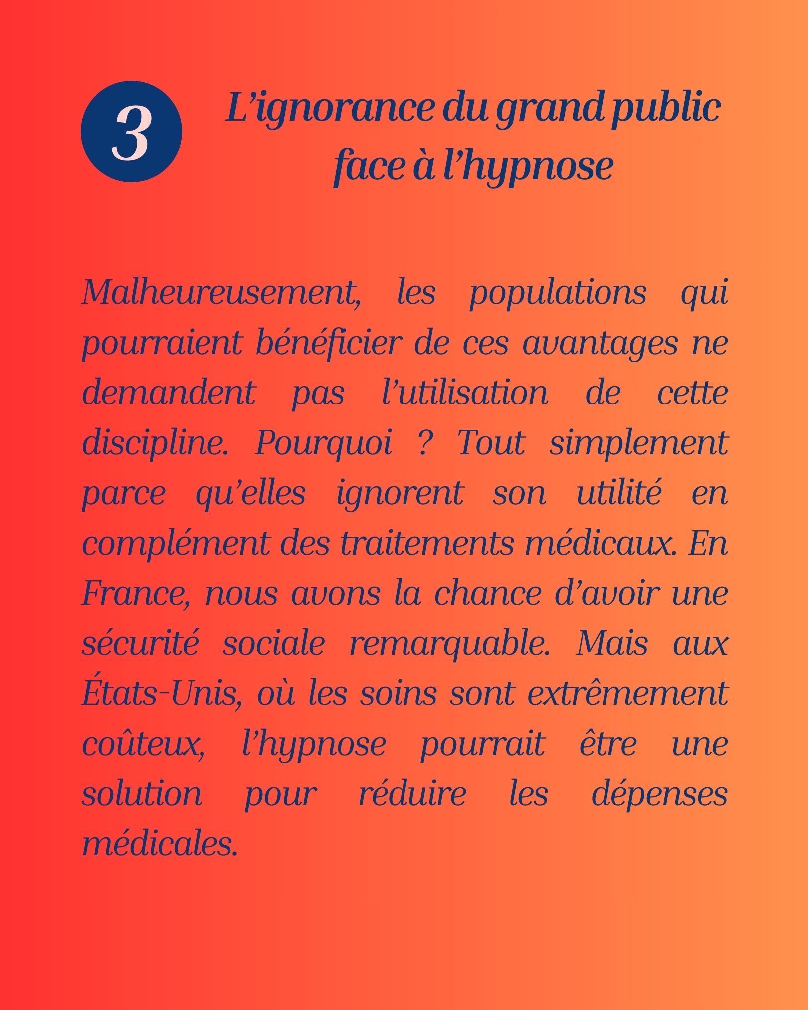 Unfortunately, the populations that could benefit from these advantages do not seek hypnosis. Why? Simply because they are unaware of its complementary role alongside medical treatments. In France, we are fortunate to have an outstanding social security system. But in the United States, where healthcare is extremely expensive, hypnosis could be a viable option to reduce medical costs.