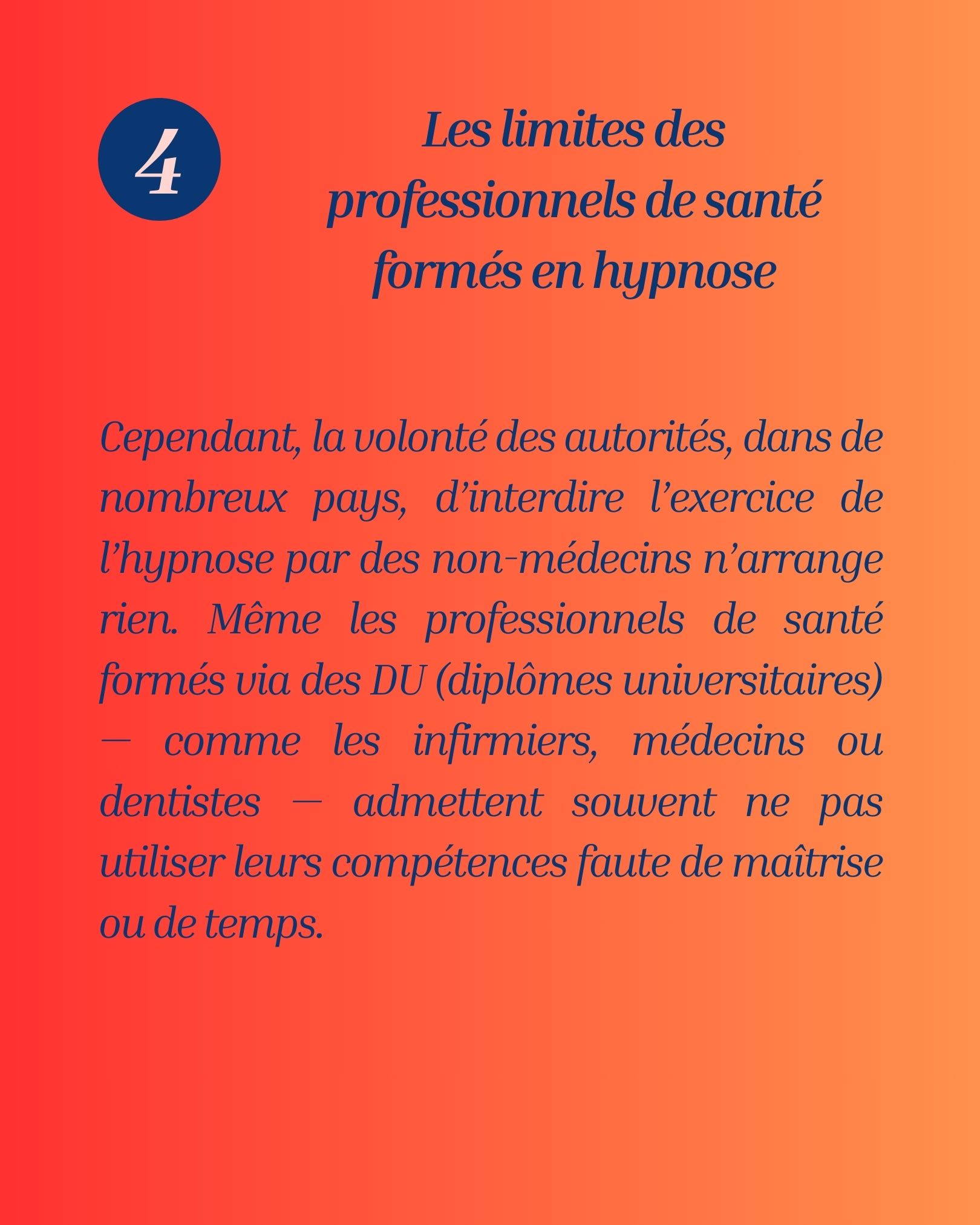 Cependant, la volonté des autorités, dans de nombreux pays, d’interdire l’exercice de l’hypnose par des non-médecins n’arrange rien. Même les professionnels de santé formés via des DU (diplômes universitaires) — comme les infirmiers, médecins ou dentistes — admettent souvent ne pas utiliser leurs compétences faute de maîtrise ou de temps.